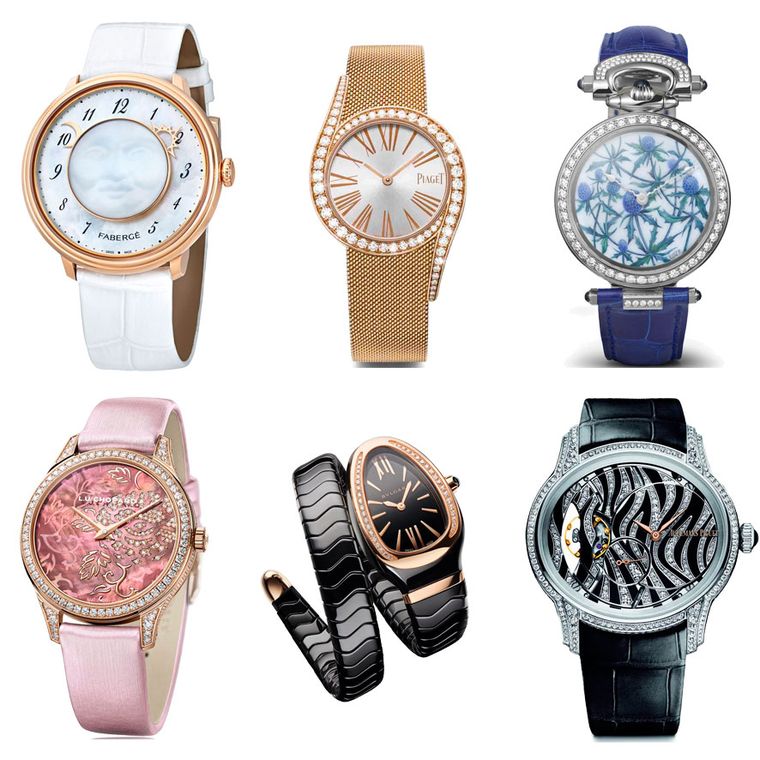 Clockwise from top left: Fabergé Lady Levity; Piaget Limelight Gala; Bovet Blue Thistles; Chopard Peony; Bulgari Serpenti Spiga; Audemars Piguet Millenary.