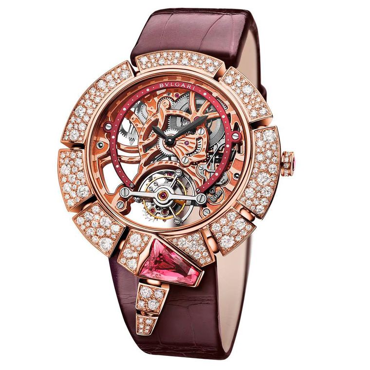Buglari’s iconic Serpenti snakes into the limelight with this stunning haute horlogerie model with a skeletonised tourbillon movement (180,000 SFR).