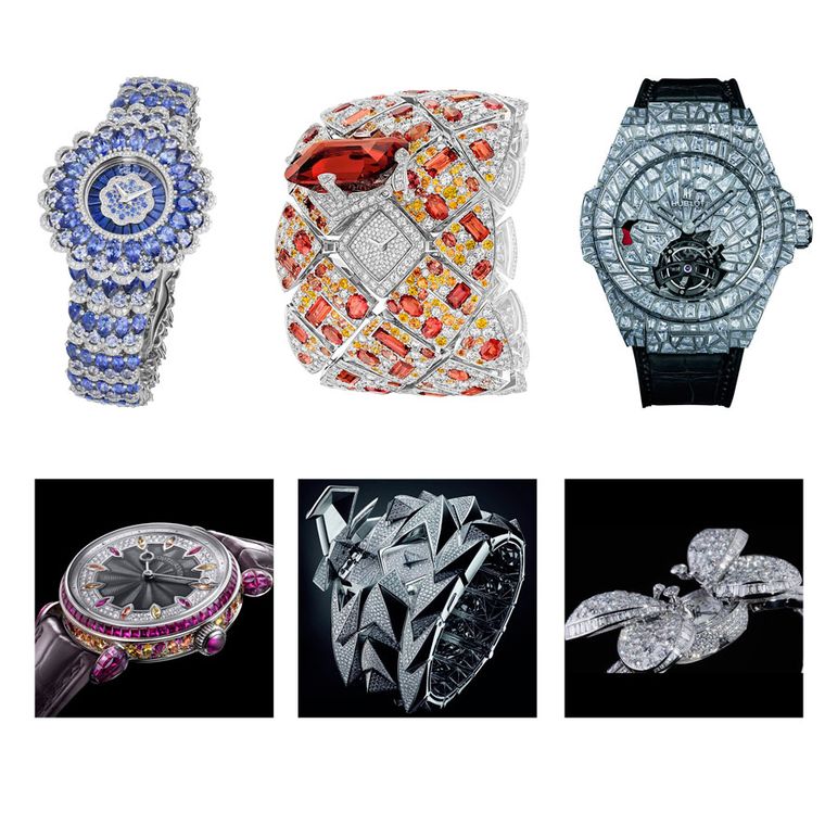 Clockwise from top left: Chopard Precious; Chanel Signature Grenat; Hublot Big Bang Impact Bang; Graff Princess Butterfly; Audemars Piguet Diamond Fury; Voutilainen Scintillante.