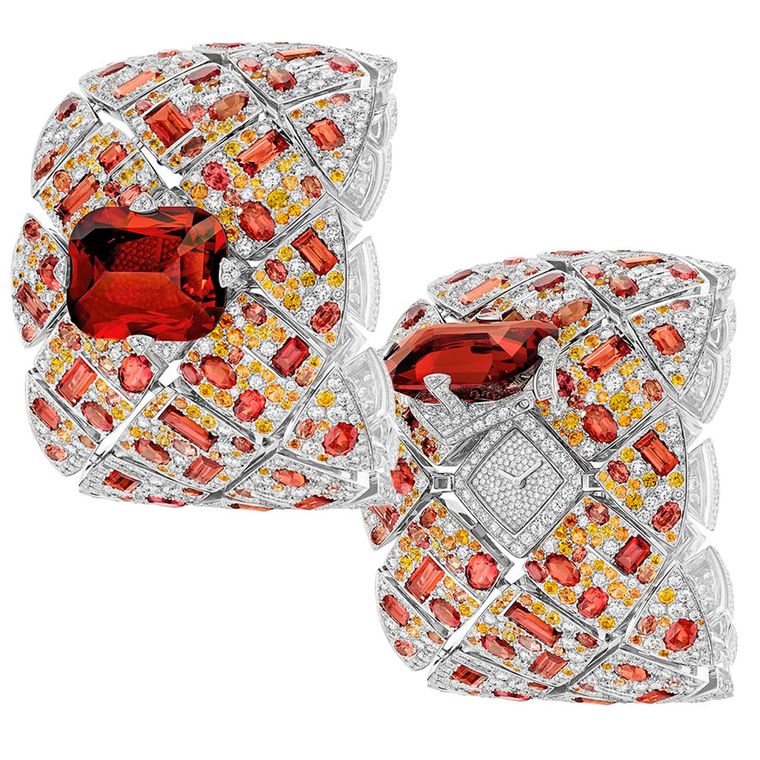 The iconic matelassé - or quilted motif - which Gabrielle Chanel took from the world of horse racing for her legendary 2.55 handbag emigrates to high jewellery, and this supple white gold cuff sits like a piece of precious embroidery on the wrist. The bracelet is set with a delicious assortment of fancy-cut orange sapphires, brilliant-cut yellow sapphires, spessartite garnets and diamonds, crowned by an impressive 39.9-carat cushion-cut garnet that slides back to reveal the secret diamond watch. A one-off piece with a total weight of 78.9 carats, this also happens to be the most expensive watch in the jewellery section and will cost the lucky owner a cool 759,000 CHF.