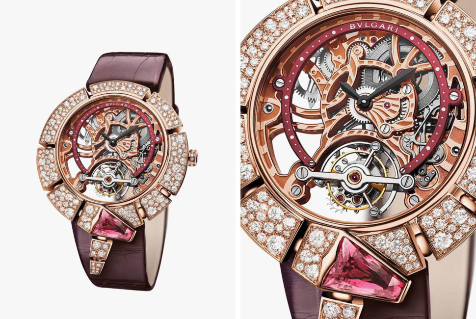 The only thing that can upstage a skeletonized dial showing off Bulgari’s tourbillon movement: a pink gold case, shaped like a serpent and incrusted with 209 diamonds and two rubellites.