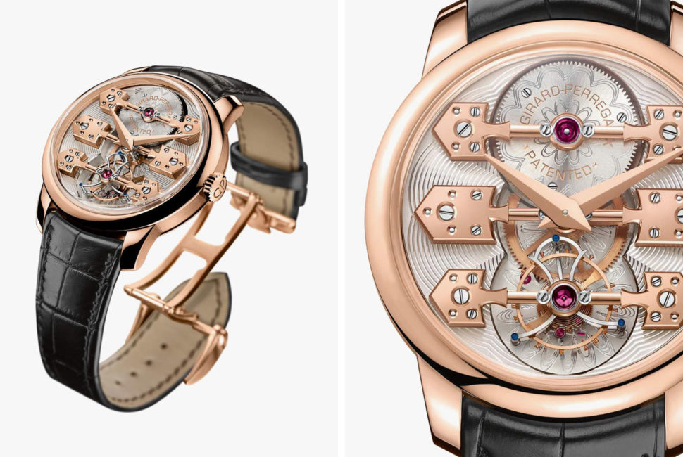 An intricate and unique watch that puts the hand-finished tourbillon movement and three pink-gold “bridges” front and center. The hand finishing of the watch takes more than two weeks to complete.