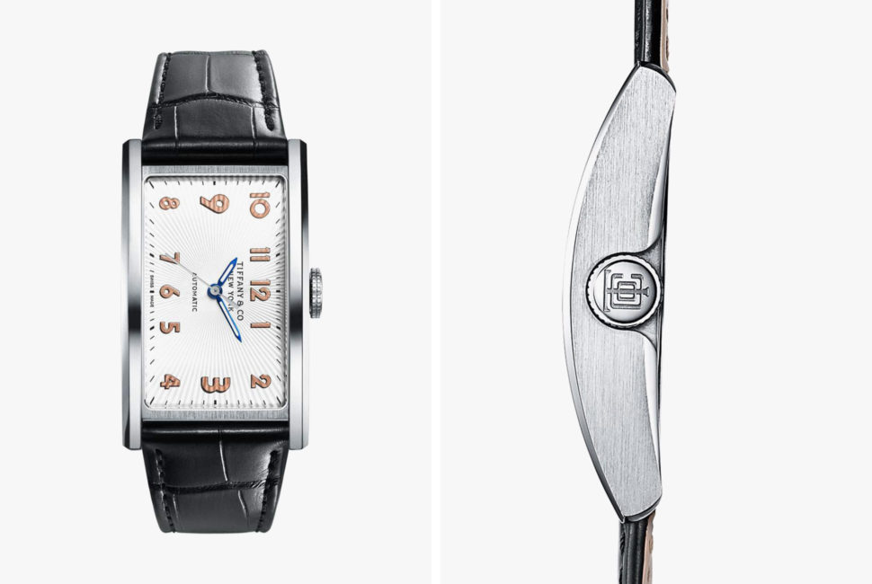 Tiffany’s East West is both esoteric and a contender for the competition’s affordable watch category, the price ceiling of which is 8,000 Swiss Francs. The sideways design is stunning — with a guilloché dial and ’40s typography for the numerals — but the watch also features a Swiss automatic movement viewed through a crescent-shaped window on the case back.